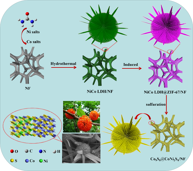 异质结构工程在发展高效全解水催化剂方面具有突出的前景。然而,生产廉价高效的双功能电催化剂仍然是一个巨大的挑战。因此,我们受构树启发,通过一种简单的方法在泡沫镍基体上来合成高催化活性和稳定性的Co9S8@CoNi2S4/NF异质结。该过程包括NiCo层状双氢氧化物在泡沫镍基体上的原位生长和原位衍生ZIF-67,并伴随S原子掺杂。所获得的Co9S8@CoNi2S4/NF多维度异质结包括一维纳米线、二维纳米片和纳米颗粒。在1.0 M KOH溶液中,当电流密度为10 mA cm-2时,经优化的Co9S8@CoNi2S4/NF在硫含量为10%时,其析氢和析氧过电位分别为68和170 mV,具有较优的电催化活性,优于最近报道的过渡金属基电催化剂。该催化剂优异的催化性能主要归因于CoNi2S4与Co9S8之间较强的界面耦合、多维结构以及定制电子结构优势。密度泛函理论表明,Co9S8和CoNi2S4之间的界面优化了多个中间体的吸附,进一步促进了水裂解动力学。这些结果为高效异质结构工程催化体系设计提供了一种通用的方法。