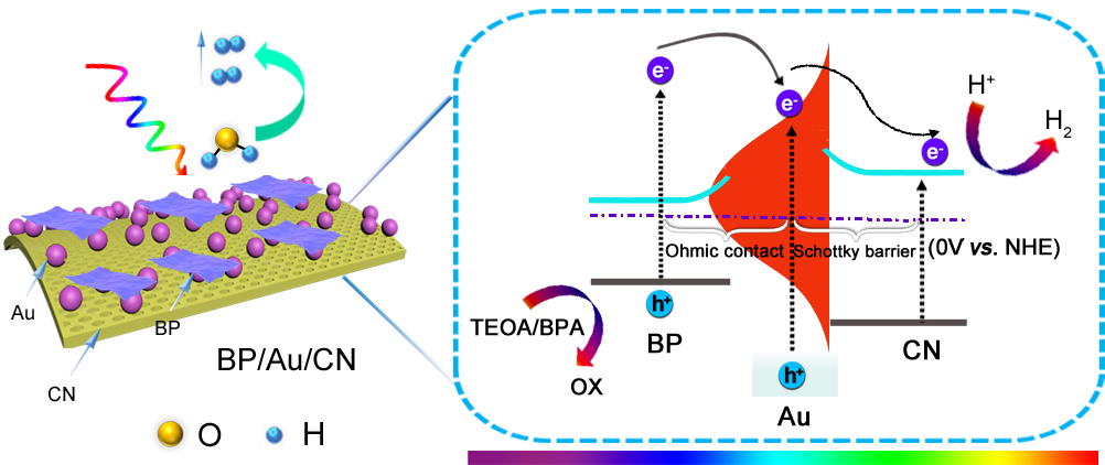 王立晶博士巧妙的通过BP/Au/CN三元异质结的设计,提高了黑磷的载流子传输性能和稳定性。在UV-vis光照射下,BP/Au/CN的H2生成速率为1400.8 μmol h-1g-1。此外,在不添加助催化剂和牺牲剂的情况下,在双酚A废水中的光催化产氢活性可以达到195.8 μmol g-1 h-1。基于实验表征和密度泛函理论计算,对其机理进行了研究。该成果的研究思路对黑磷基光催化剂的设计合成具有重要指导意义。