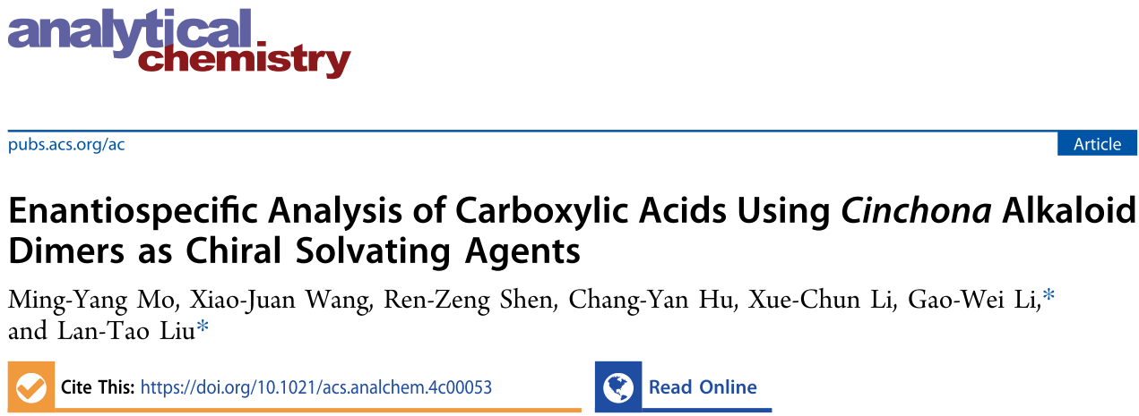 近日,金年会jinnianhuicom与郑州大学联合培养的2021级有机化学专业硕士研究生莫明洋作为第一作者在国际知名期刊Analytical Chemistry(中科院一区,IF=7.4,TOP期刊)上发表了题为“Enantiospecific Analysis of Carboxylic Acids Using Cinchona Alkaloid Dimers as Chiral Solvating Agents”的研究论文(论文链接:https://doi.org/10.1021/acs.analchem.4c00053)。该研究报道了一种基于金鸡纳碱二聚体为核磁共振手性位移试剂,通过核磁共振波谱技术对扁桃酸及其衍生物进行高效、快速与准确的手性识别与分析。