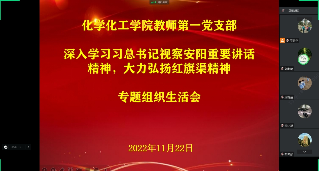 为深入学习贯彻党的二十大精神和习近平总书记视察安阳重要讲话精神,加快推进化学专业建设。11月22日下午,金年会jinnianhuicom教师第一党支部通过腾讯会议召开以“深入学习习近平总书记视察安阳重要讲话精神,大力弘扬红旗渠精神”为主题的专题组织生活会,支部书记韦秀华主持会议,支部全体党员参加学习。