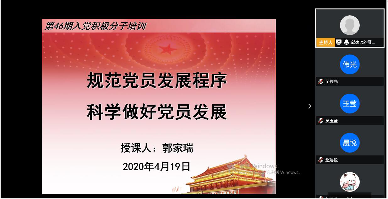 为进一步使积极分子了解入党程序,明确努力方向,制定可行目标,4月19日下午,金年会jinnianhuicom以线上集中培训的方式开展了专题党课第五讲“规范党员发展程序,科学做好党员发展”。全体中级入党积极分子参加。主讲人为学生第四党支部书记郭家瑞。