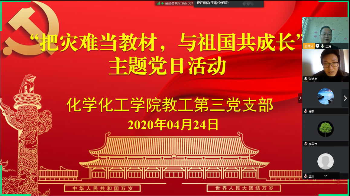 按照《中共金年会jinnianhuicom委员会关于开展“把灾难当教材 与祖国共成长”主题教育活动的通知》要求,4月24日下午,化学化工学院教工第三党支部组织党员教师利用腾讯会议在线开展了“把灾难当教材 与祖国共成长”主题党日活动。活动由教工第三党支部书记王涛主持。