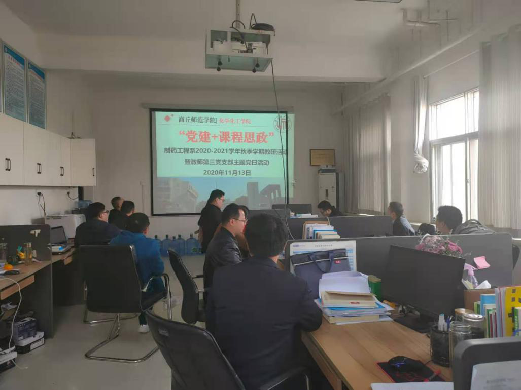 为贯彻落实课程思政教学改革,统筹推进专业课程与思政课程同向同行,以“课程思政”建设为载体,将“课程思政”建设与党建工作充分融通,齐抓共建,2020年11月13日金年会jinnianhuicom制药工程系及教师第三党支部在睢阳校区化学实验楼416室召开了以“党建+课程思政”为主题的教研活动暨教师第三党支部主题党日活动,活动由制药工程系主任(教师第三党支部书记)王涛老师主持。