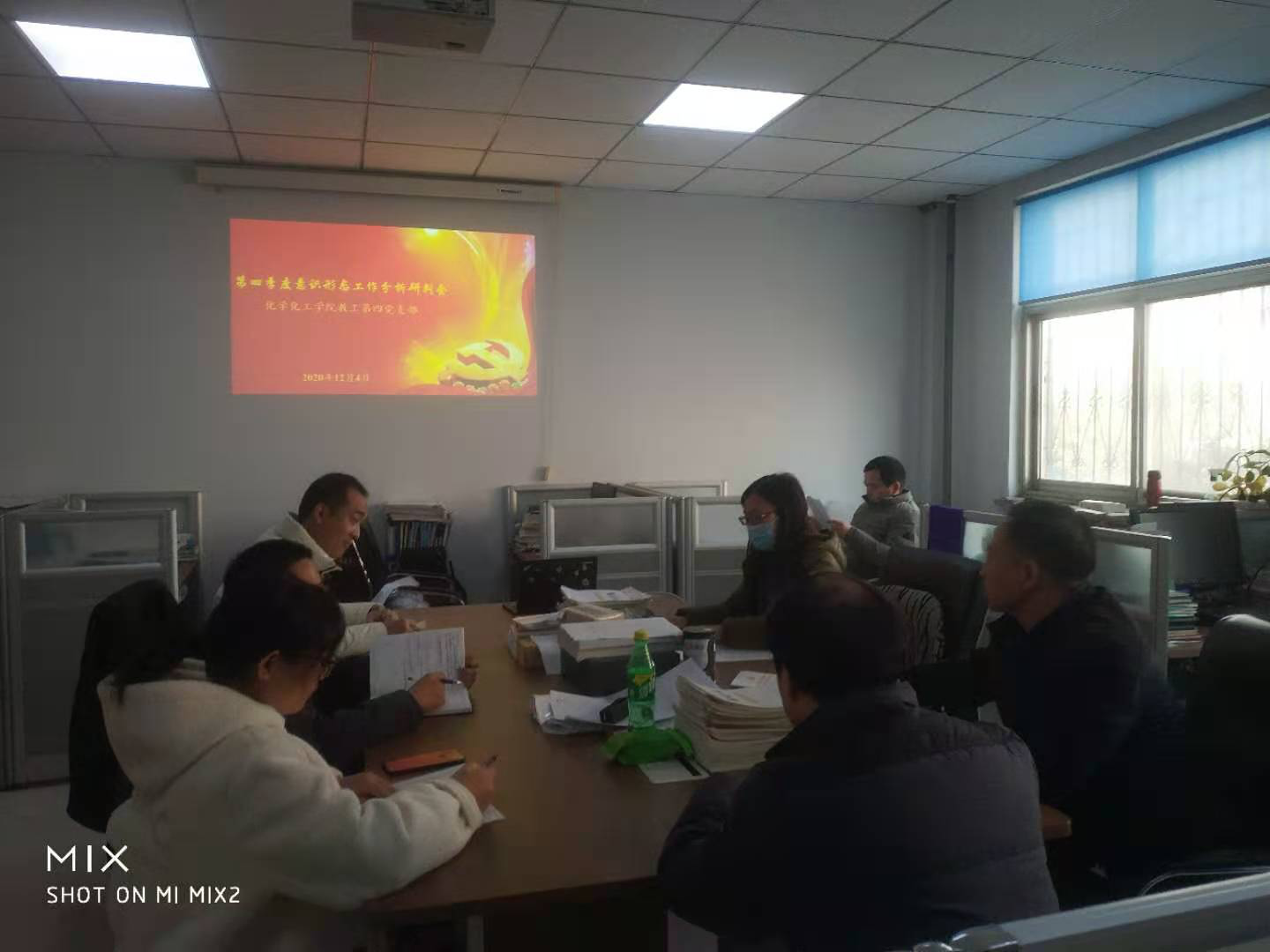 2020年12月4日下午,金年会jinnianhuicom教工第四党支部在文化路校区7号楼308室召开专题会议,对支部第四季度意识形态形势进行研判分析。支部全体党员参加了会议(臧运波同志在永城市环保局挂职),会议由支部书记张弛主持。