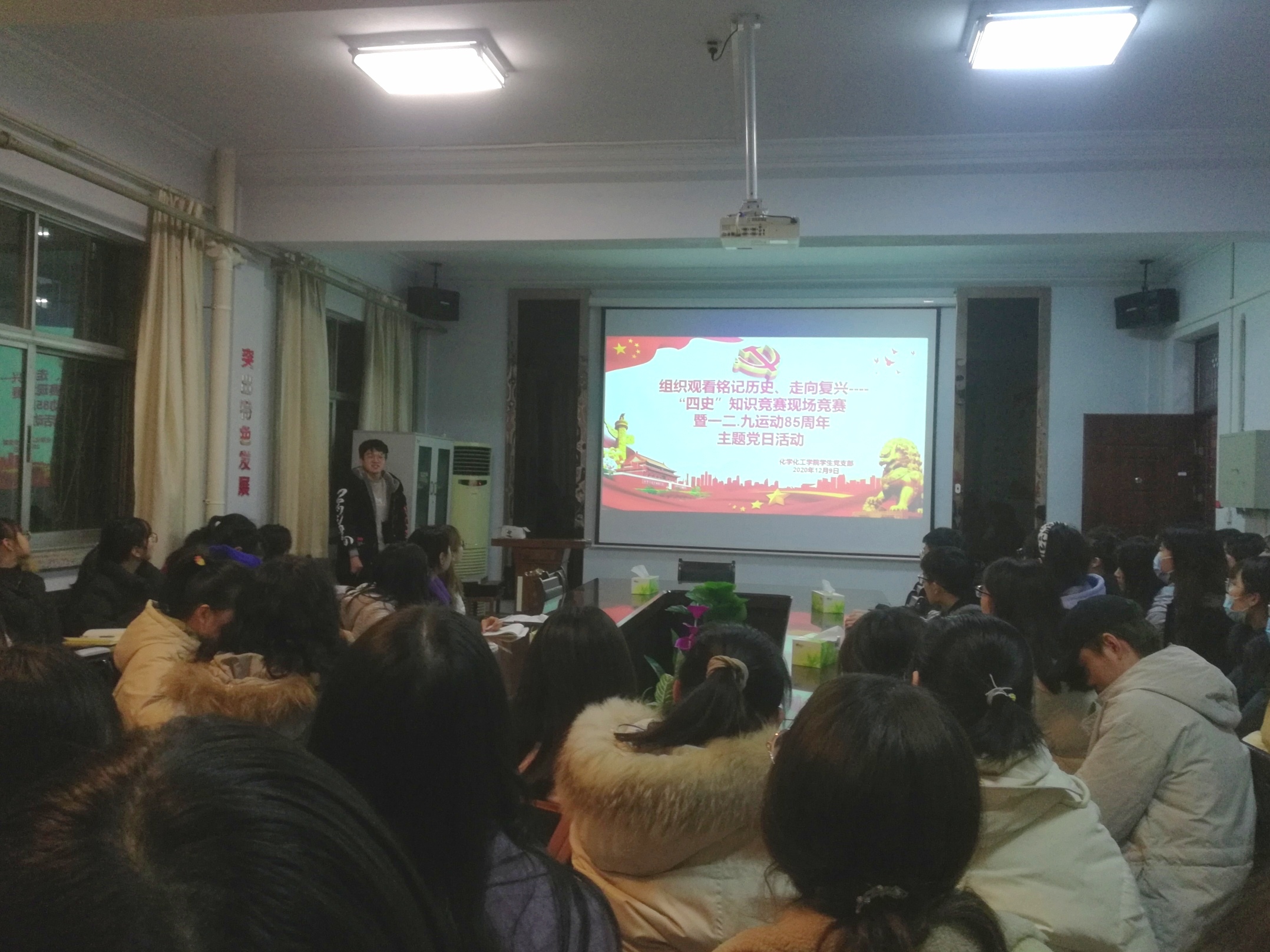为深入学习贯彻习近平新时代中国特色社会主义思想,特别是习近平总书记关于“四史”的重要论述,进一步提升党员干部理论素养和党性修养,持续营造学的氛围、严的氛围、干的氛围,2020年12月9日,金年会jinnianhuicom学生党支部于睢阳校区7号楼会议室组织观看了铭记历史、走向复兴——“四史”知识竞赛现场竞赛暨一二•九运动85周年主题党日活动。