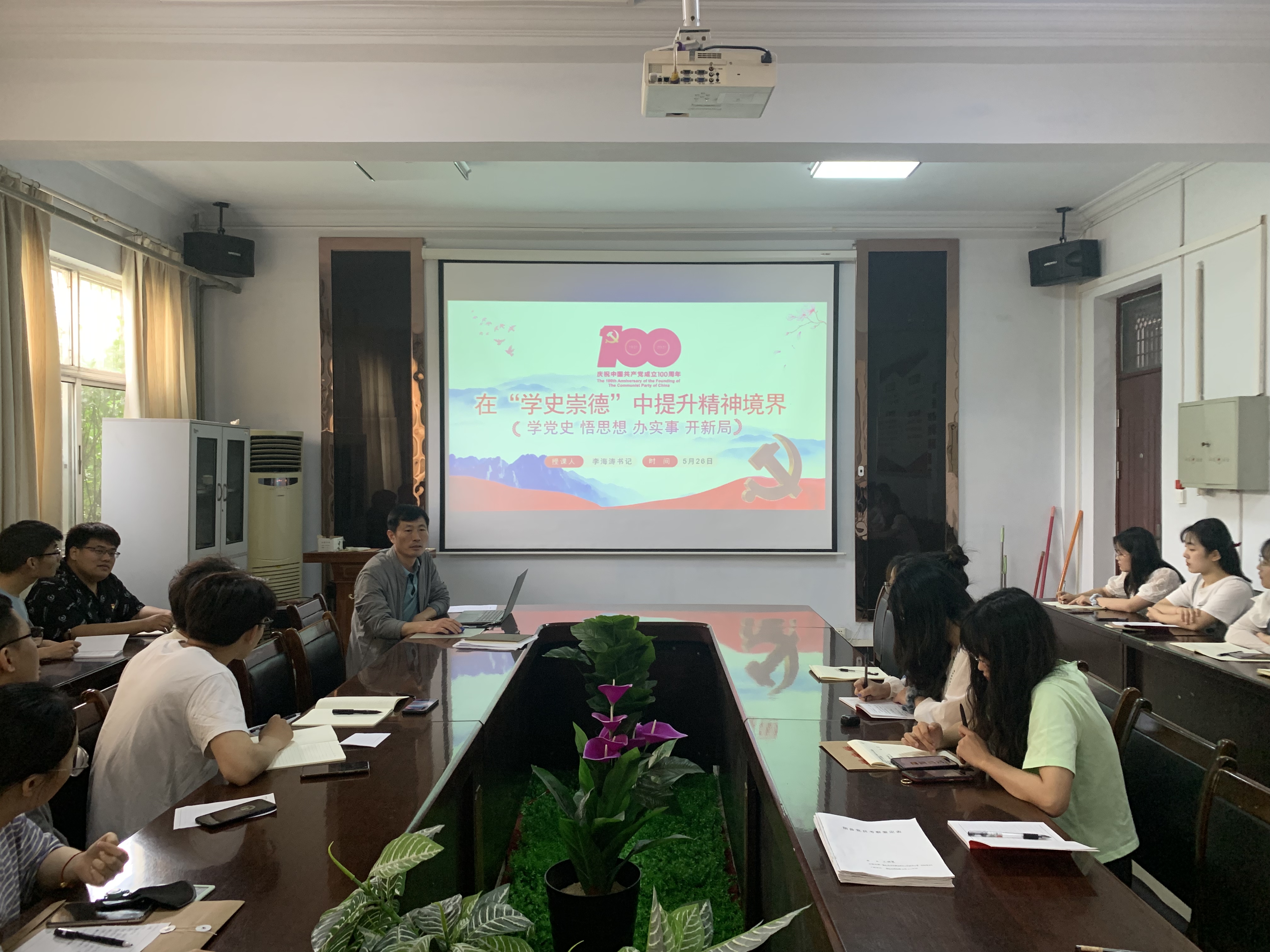 会议伊始,全体起立,奏唱国歌。刘瑛向与会党员传达了《关于做好2012届毕业生党员组织关系转移工作的通知》文件精神,强调了组织关系转移注意事项,并嘱托毕业生党员珍惜在校的每一天,站好最后一班岗,继续为同学做好服务,配合学院、老师做好毕业生离校相关工作。随后,学生第二党支部毕业生党员代表李远洋带领大家重温了入党誓词。最后,李海涛为大家上了一堂《在“学史崇德”中提升精神境界》党课。