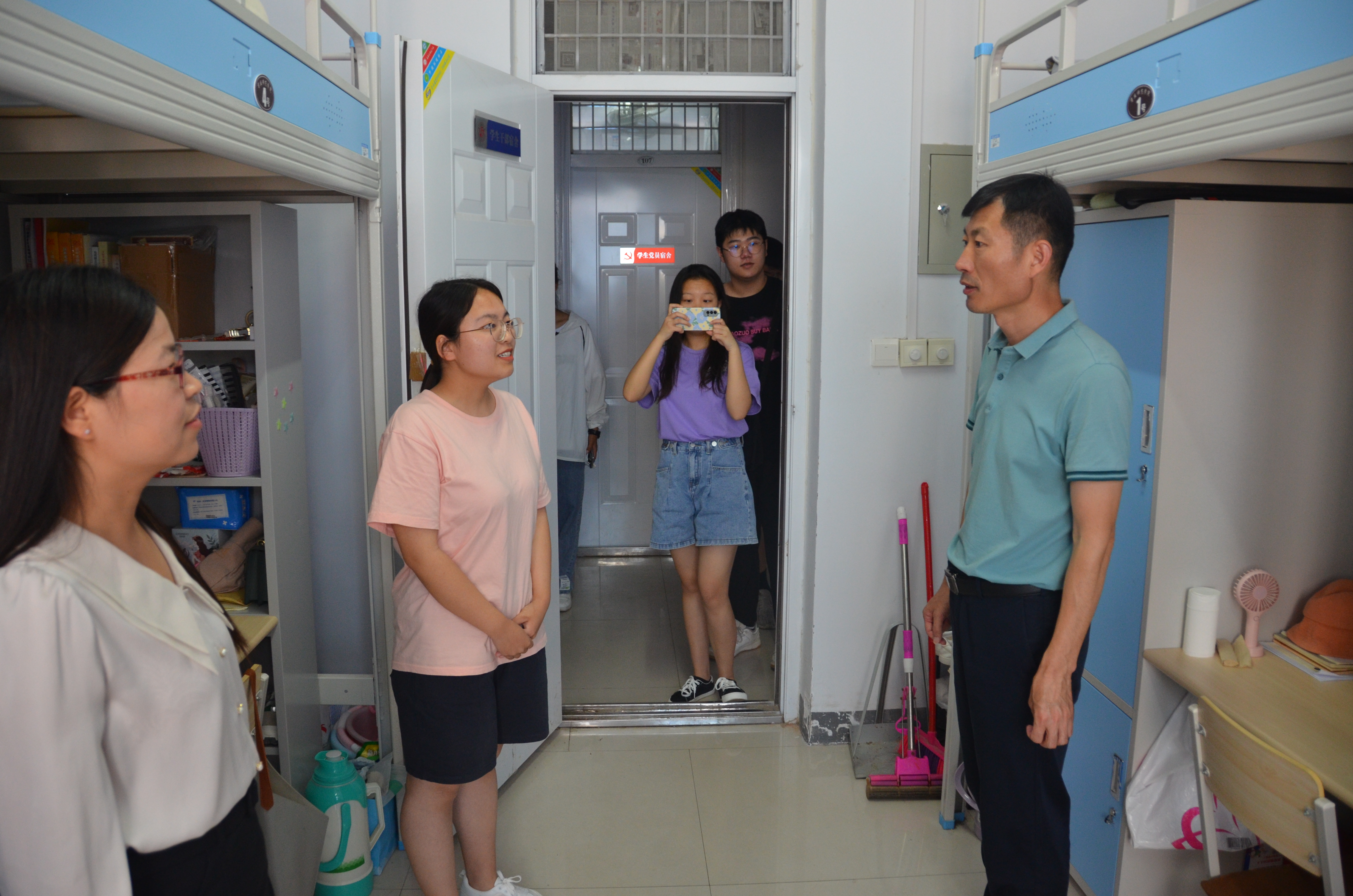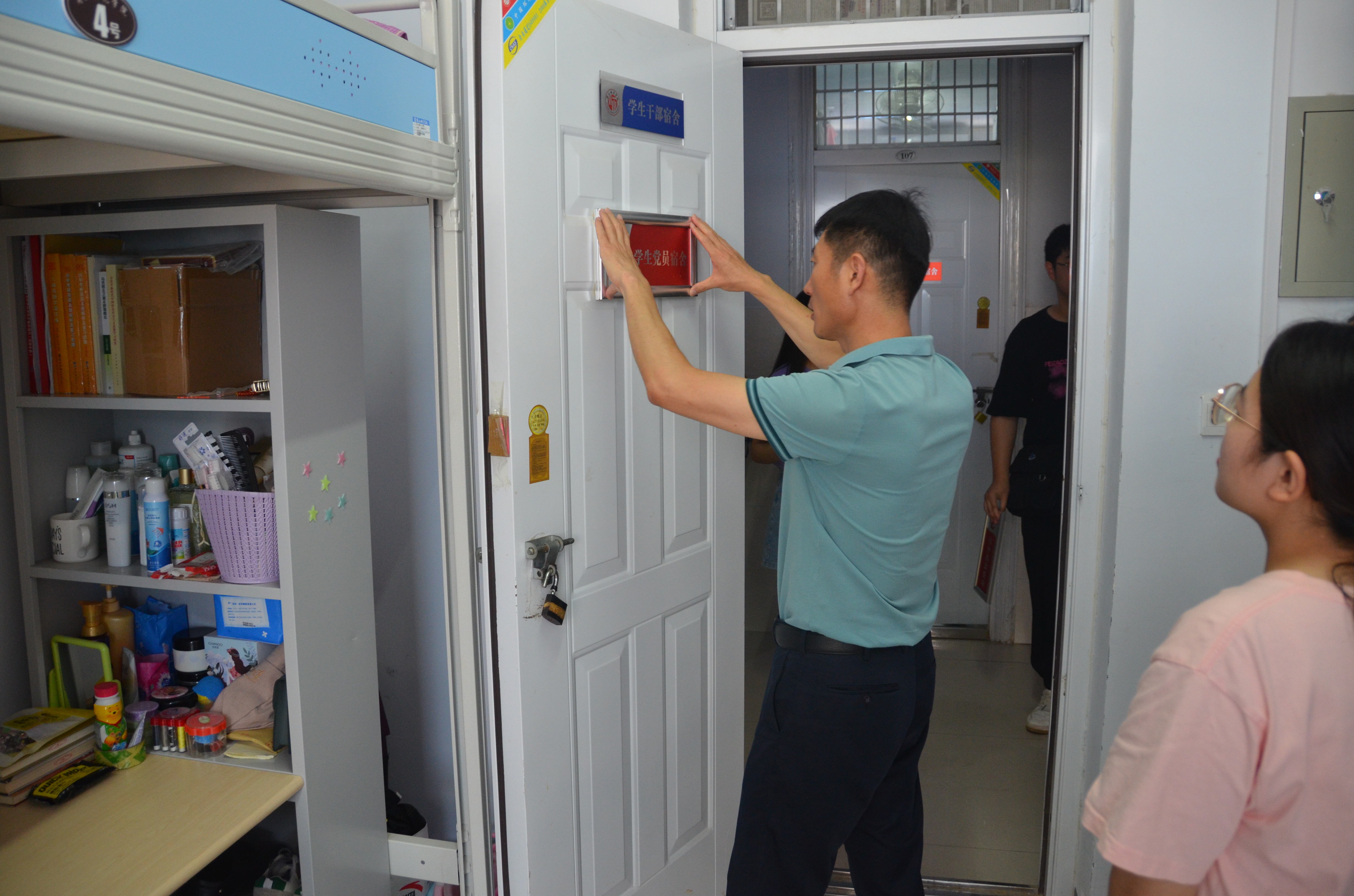 为扎实推进党史学习教育,庆祝建党100周年,充分发挥学生党员的先锋模范作用,6月23日,金年会jinnianhuicom开展了“亮身份、做表率——共创整洁、文明、和谐宿舍”学生党员宿舍挂牌活动。院党委书记李海涛出席活动、团总支副书记郭家瑞和学生会部分成员参加活动。