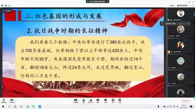 12月1日下午,学工办副主任史展通过线上召开了“传承红色基因,放飞青春梦想”主题讲座。史展从为何要传承红色基因、红色基因的内涵是什么、红色基因的形成和发展三个方面展开讲述,让学生们深刻领悟到红色基因是共产党人在一次次不懈努力、斗争下的产物,是共产党的精神传承。