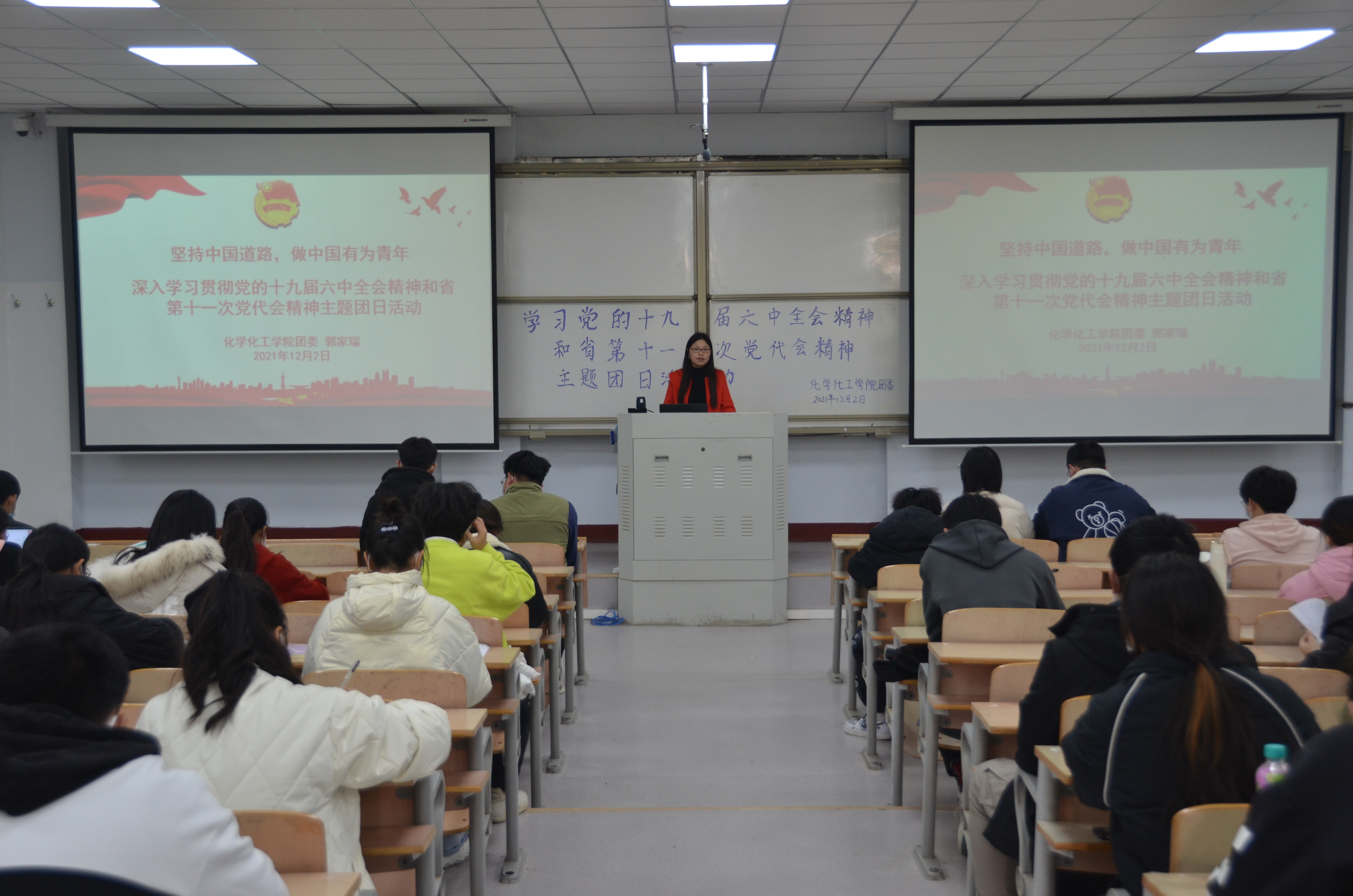 12月2日中午,团委副书记郭家瑞于睢阳校区1号教学楼106教室开展了“坚持中国道路,做中国有为青年”主题讲座。郭家瑞向学生们讲解了当代优秀青年的事迹,带领学生们深入了解十九届六中全会精神。并就中国近年来取得的辉煌成就鼓励学生们今后要坚定不移的走中国道路。讲座最后,郭家瑞展示了伟人认真学习照片,激励学生们向伟人看齐,成为一个优秀的新时代青年。