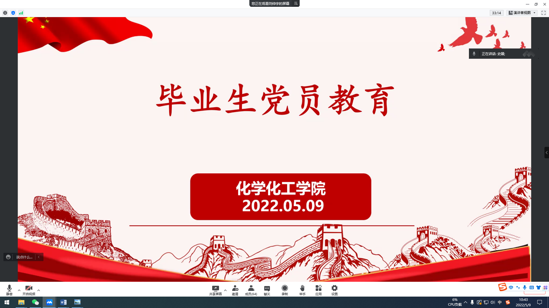为做好2022届毕业生党员组织关系转移工作,金年会于2022年5月9日,在腾讯会议召开毕业生党员教育会议,毕业班辅导员史展主持,2022届全体毕业生党员参加。