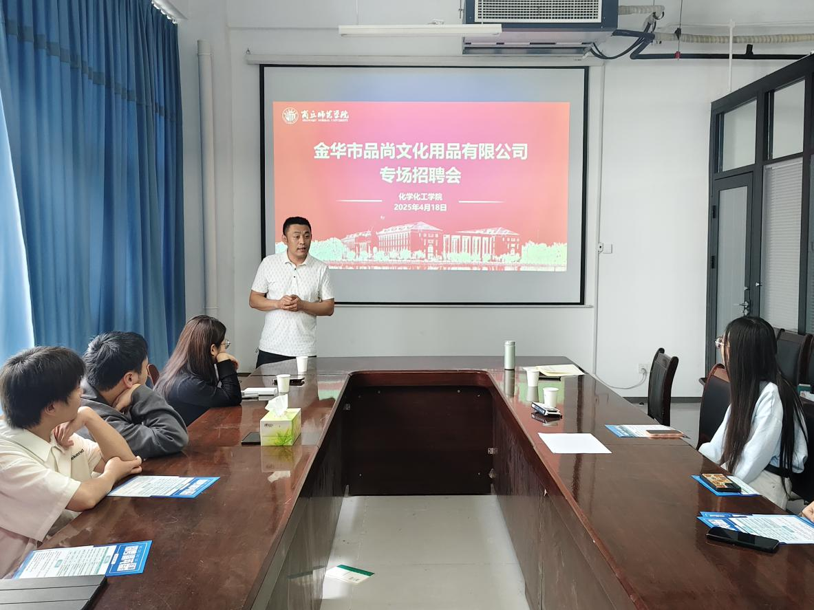 为搭建企业与高校人才交流的优质平台,助力毕业生实现高质量就业,4月18日下午,金年会jinnianhuicom邀请到河南瑞柏新材料有限公司、金华市品尚文化用品有限公司两家企业到学院为2025届毕业生进行就业宣讲,此次会议由2025届毕业班辅导员郭家瑞主持。