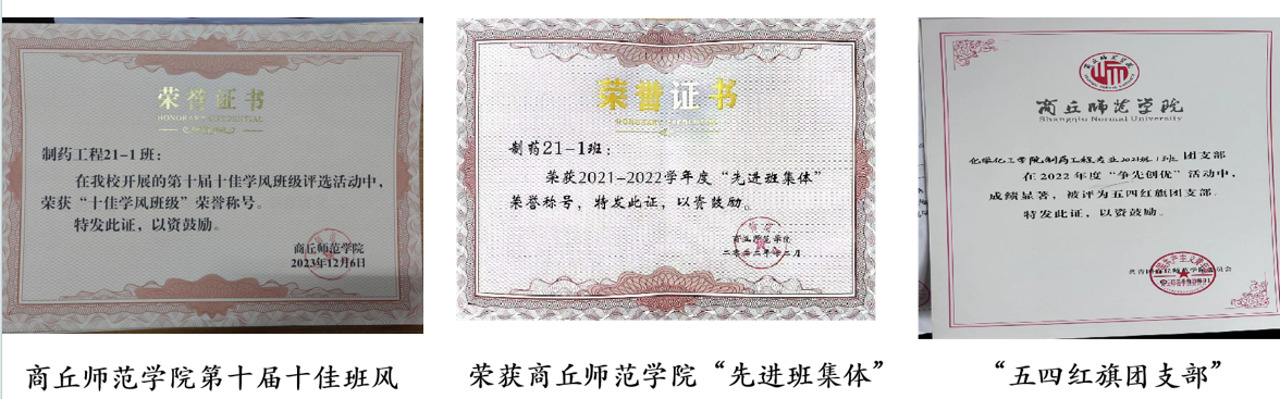 在过去的四年里,班集体以及班级里成员取得了许多荣誉。例如“十佳学风班级”、“文明班级”、“先进班集体”、“五四红旗团支部”等班级荣誉称号,“文明学生”、“优秀学生干部”、“三好学生”等个人荣誉称号。