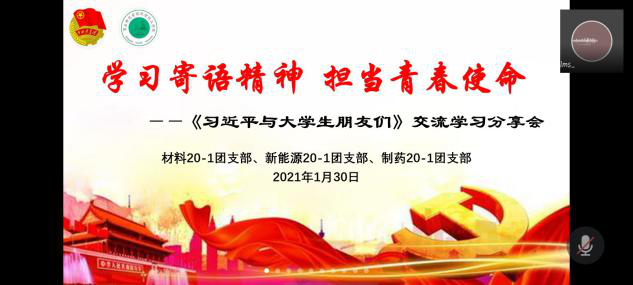 寒假期间,金年会jinnianhuicom团总支组织团员青年积极学习《习近平与大学生朋友们》一书,为进一步巩固学习效果,1月30日在线开展了读书心得分享会活动。校团委社团管理部副部长邵一方、金年会jinnianhuicom团总支副书记郭家瑞参加活动。各团支部代表参加分享会。