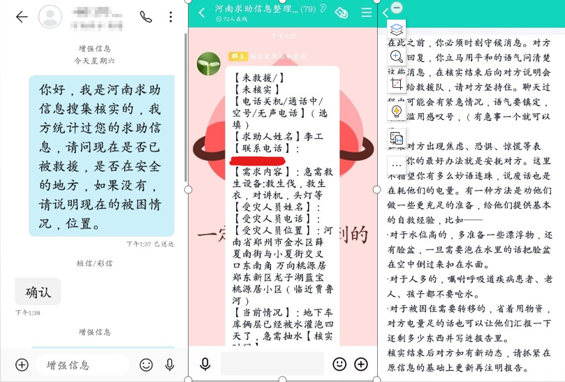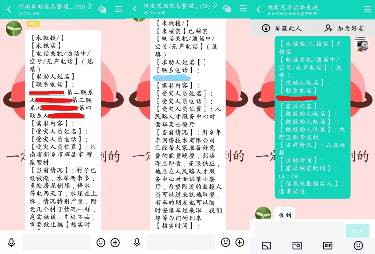 18级新能源科学与工程专业的于静甜是一名线上志愿者,在志愿者群中进行搜集、核实求助信息,并根据群内发出的通知、模板以及步骤去高效完成任务。她通过发短信或打电话的方式核实求助信息之后,便将信息发送给群主审核,审核过关之后即可接下一个任务,从而帮助更多的受灾群众。
