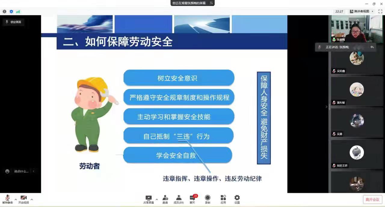 为进一步加强学生对劳动安全的理解,增强劳动安全意识。3月17日,金年会jinnianhuicom通过腾讯会议开展了大学生与劳动安全线上主题讲座。主讲人为院党委副书记张颜梅。19级、20级全体班委和宿舍长参加此次讲座。