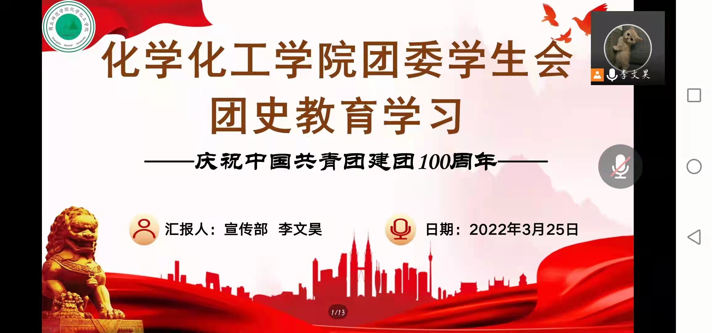 为深化团学干部对团史的认识,进一步强化对团组织的认识,3月25日,金年会jinnianhuicom团委学生会开展线上会议,进行百年团史学习教育。会议由院学生会宣传部负责人李文昊主持,院团委学生会全体成员参加。