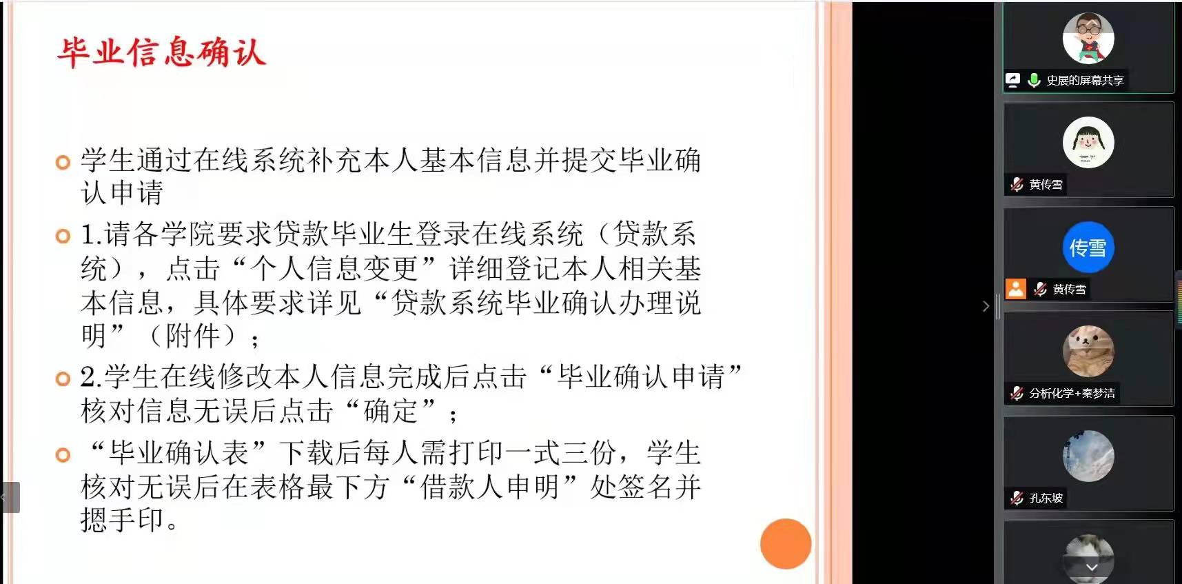 为帮助贷款毕业生了解还款流程,加强贷款毕业生毕业后管理工作,2022年4月16日,金年会jinnianhuicom利用腾讯会议召开2022届毕业生还款教育会议。会议由学院资助工作负责人史展老师主持,全体2022届贷款毕业生参加。