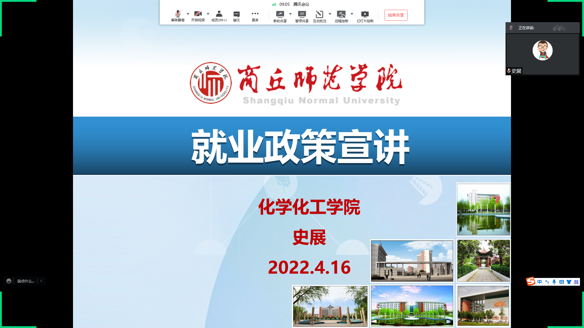 为加强金年会学生对当前就业政策的了解,明确就业目标,提高就业竞争力,金年会于4月16日利用腾讯会议召开了就业政策宣讲会,毕业班辅导员史展主讲,2018级全体学生参加。