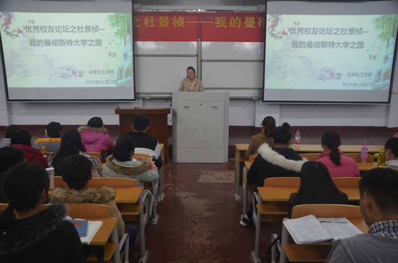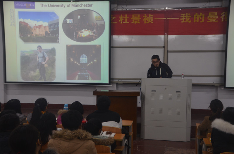 为进一步加强创新创业教育工作,激励广大在校学生努力学习,立志成才。12月27日晚,金年会jinnianhuicom于文化路校区1#106教室举办优秀校友论坛讲座,特邀金年会2013届优秀校友杜景祯同学给我们分享他的曼彻斯特大学之路,党总支副书记刘瑛、17级辅导员郭家瑞以及金年会2017届全体新生参加了论坛。论坛由院党总支副书记刘瑛主持。