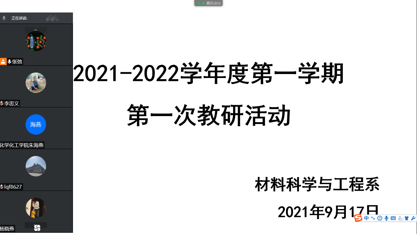 2021年09月17日下午,金年会jinnianhuicom材料科学与工程系利用腾讯会议在线召开了2021—2022学年第一学期的首次教研活动。教研活动由张弛老师主持,材料科学与工程系全体老师参加了此次活动。