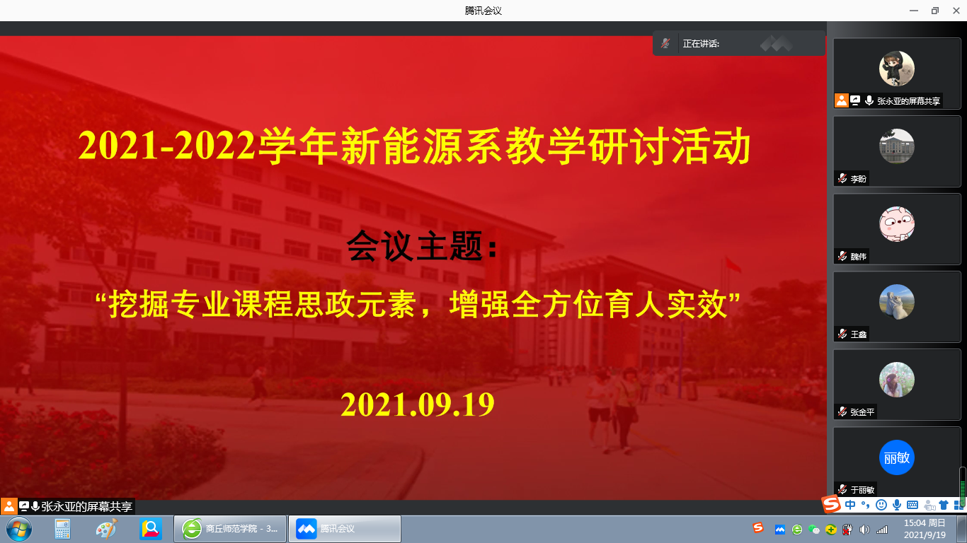9月19日下午,金年会jinnianhuicom新能源系召开了以“挖掘专业课程思政元素,增强全方位育人实效”为主题的教研活动。会议由系主任魏伟老师主持,新能源系全体教师参加了此次活动。