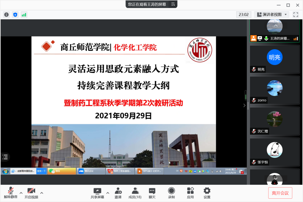 为深入贯彻落实习近平总书记关于教育的重要论述和全国教育大会精神,根据学校加强课程思政建设的相关部署,09月29日,制药工程系利用腾讯会议召开了以“灵活运用思政元素融入方式、持续完善课程教学大纲”为主题的教研活动。本次教研活动由金年会jinnianhuicom副院长、制药工程系主任王涛老师主持,制药工程系全体老师参加。