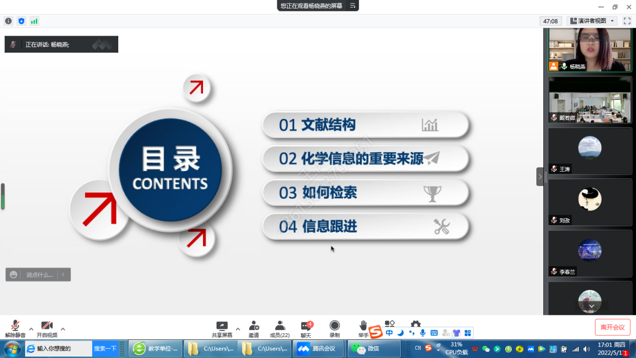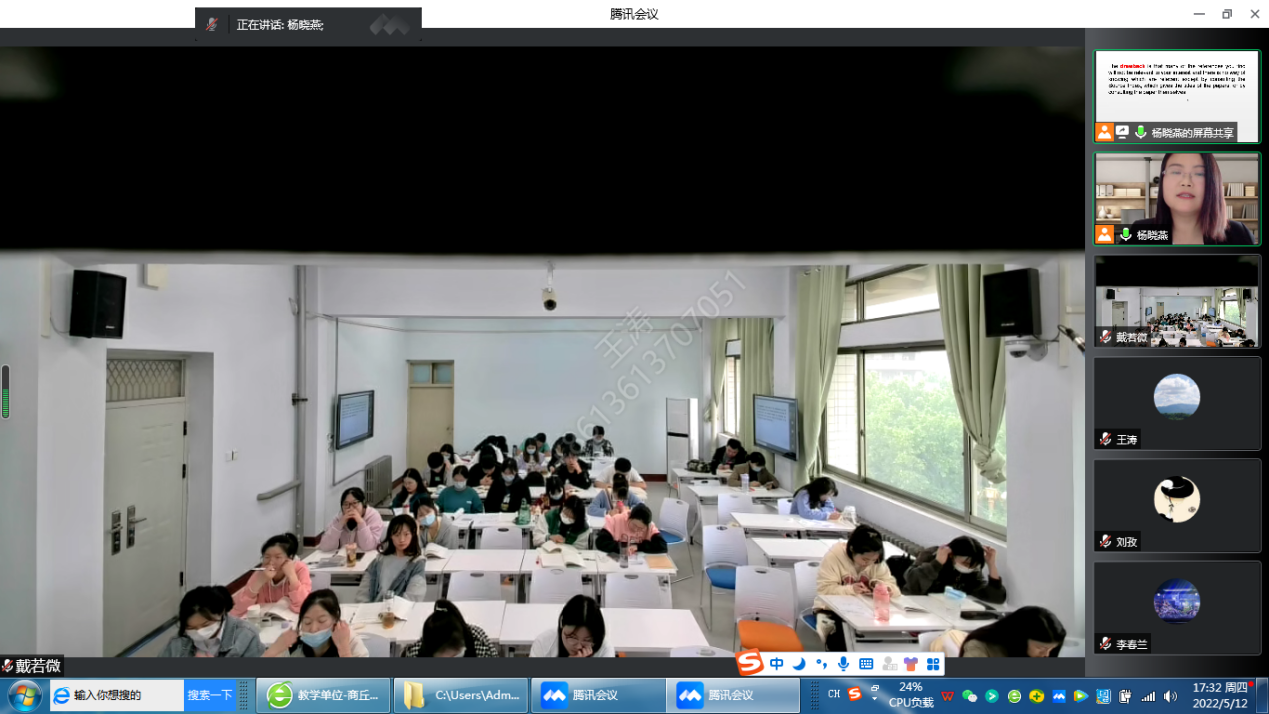 2022年5月12日下午第7节,金年会jinnianhuicom杨晓燕老师《专业外语》公开课通过腾讯会议进行。金年会jinnianhuicom副院长王涛以及近两年新进无课老师在线进行了观摩。