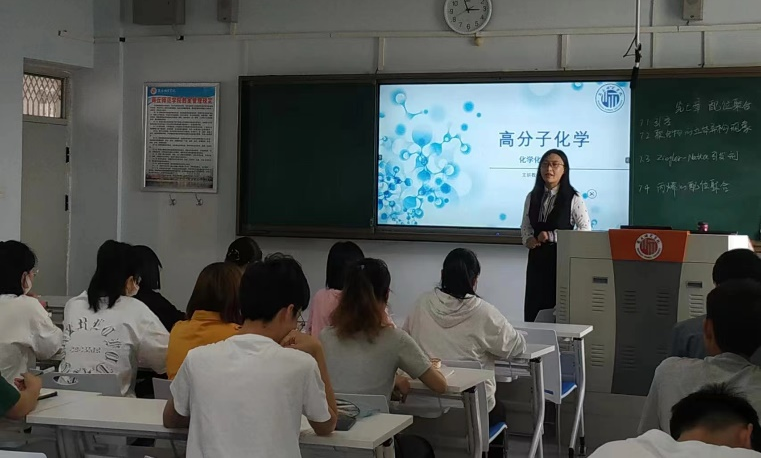 2022年5月19日下午第5节,金年会jinnianhuicom邵梅玲老师《高分子化学》课程教学范式改革公开课在睢阳校区1#513教室进行。材料系主任陈亚以及近两年新进青年教师进行了课堂观摩。