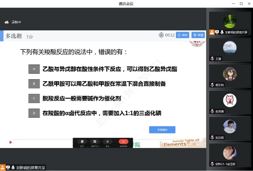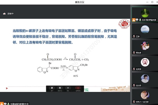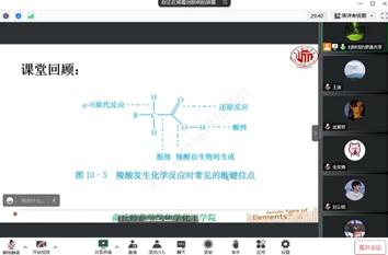 11月23日上午第三节,金年会jinnianhuicom刘新明老师的《有机化学》课程教学范式改革公开课线上如期进行,副院长王涛、校教学督导团成员张付力、院督导团成员臧运波、制药工程系主任张明亮以及部分青年教师进行在线观摩。