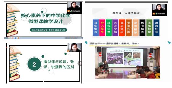 活动开始,王涛充分肯定了各位指导老师的敬业精神、专业能力和学生们积极认真的学习态度,并介绍了本次集体培训活动的内容和任务。接着李文静老师通过腾讯会议进行了《核心素养下的中学化学微型课教学设计》的专题讲座。李老师从什么是微型课,微型课与说课、微课、说播课的区别,如何讲好微型课等三个方面进行阐述。重点从新课导入、过程讲解、练习巩固等几个环节分别详细讲解了“如何讲”。并通过播放往年优秀的微型课教学视频,与学生们一起分析案例中的亮点和不足,加深学生对微型课技巧的理解。