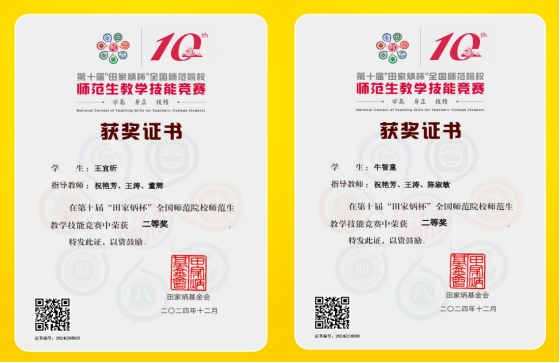 2024年11月29日至12月1日,第十届“田家炳杯”全国师范院校师范生教学技能竞赛决赛在浙江师范大学落下帷幕。金年会2021级王宜昕、2022级牛智童在众多来自全国各地的优秀选手中表现出色,分别荣获高中化学组、初中科学组全国二等奖。