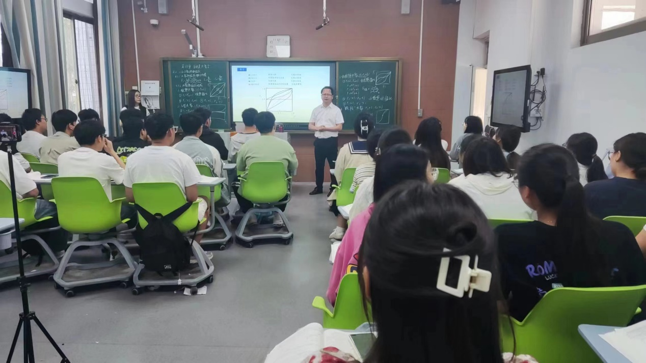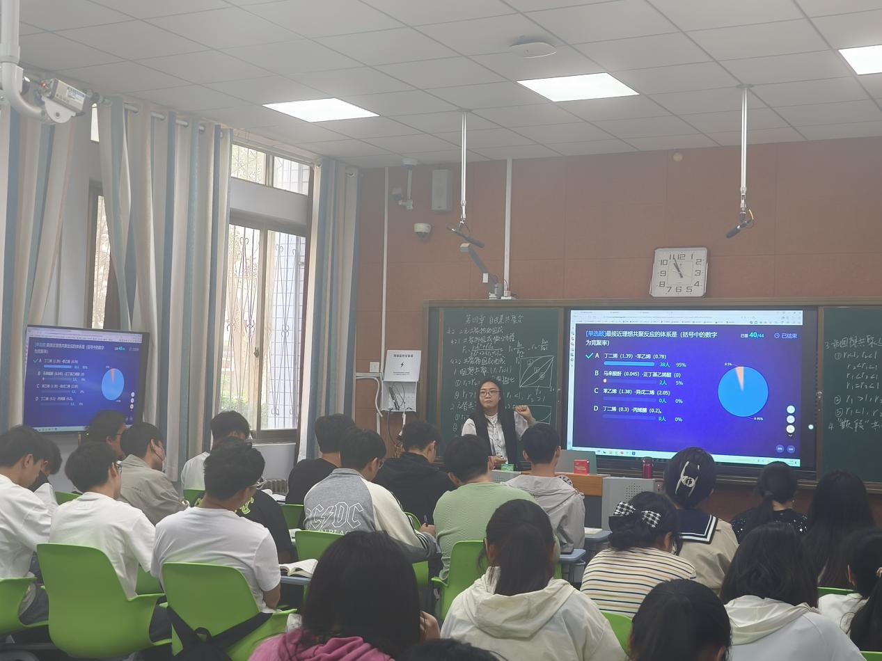 本次公开课的内容是“共聚组成曲线”。课前,学生通过学习通预习《二元共聚物的组成》线上课程资源。课中,由学习小组代表对共聚组成微分方程的推导过程进行了总结汇报,师生进行随堂测评、提问,教师详细阐述共聚组成曲线的概念、构建方法以及在高分子材料设计和合成中的应用,并通过丰富的案例和最新研究进展,向学生展示了如何通过调整共聚物的组成来控制其性能,进而满足不同领域的需求。课后,发布绘制某种高分子共聚物的共聚组成曲线的任务,鼓励学生结合所学知识和实际应用,提出自己的见解和解决方案。