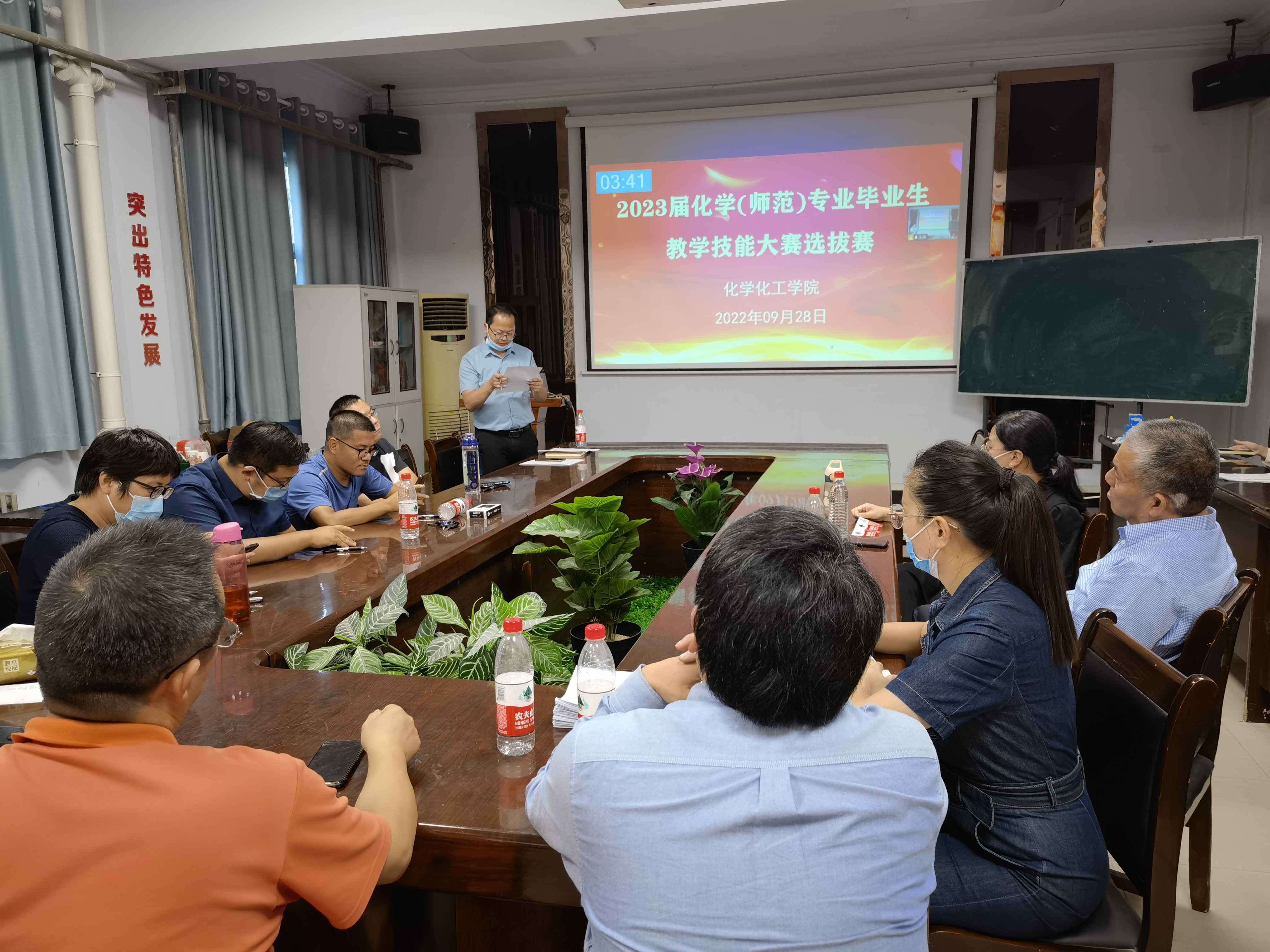 为加强金年会化学专业教育实习工作,切实提高化学师范生教学技能,选拔优秀选手参加河南省第二十届师范教育专业毕业生教学技能大赛,学院于9月28日在7号楼103会议室举行了2023届化学(师范)专业毕业生教学技能大赛选拔赛。全体校内教育实习指导老师、参赛选手、化学(全免)师范生参加了本次选拔赛,活动由副院长王涛主持。